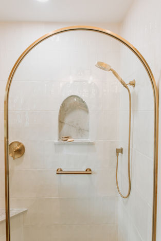An arched shower niche, lined with the same quartz used for the 2.5" drop mitre vanity top, creates a cohesive and refined look. Beaded shaker cabinet doors introduce subtle texture, complemented by a washable yellow area rug that doubles as a cheerful, practical bath mat. Benjamin Moore’s Ballet White graces the walls, infusing the room with a soft, inviting glow. Every element, from the gentle arches to the thoughtful material choices, was designed to make this small bathroom feel expansive, light, and full of warmth.